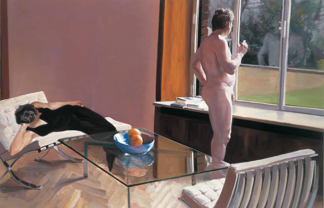 já despido, pega o copo e olha pela janela, tecendo comentários preguiçosos e